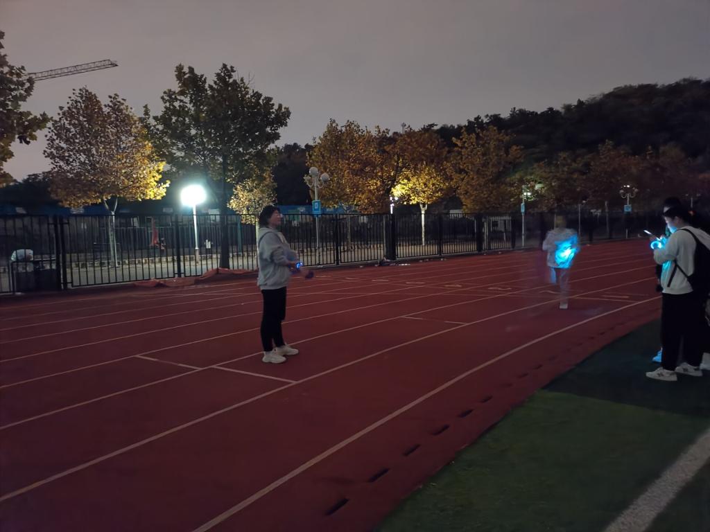 活动开始前十分钟,当天的活动负责人提前到达中苑操场进行准备工作。晚8点钟,活动准时开始,参加活动的同学们陆陆续续进入操场至活动负责人处签到并领取夜跑荧光手环。接着,签到过后的同学们纷纷踏入田径场进行夜跑锻炼。同学们在黑夜中挥洒汗水,腕上的荧光彼此相连,彰显生命的律动。同时,在夜跑过程中,活动负责人全程关注活动参与者的身体情况,以防止出现安全问题。最后,结束锻炼的同学们将手机软件记录的跑步里程数向负责人展示,负责人登记过后回收荧光手环,顺利结束当天的活动。